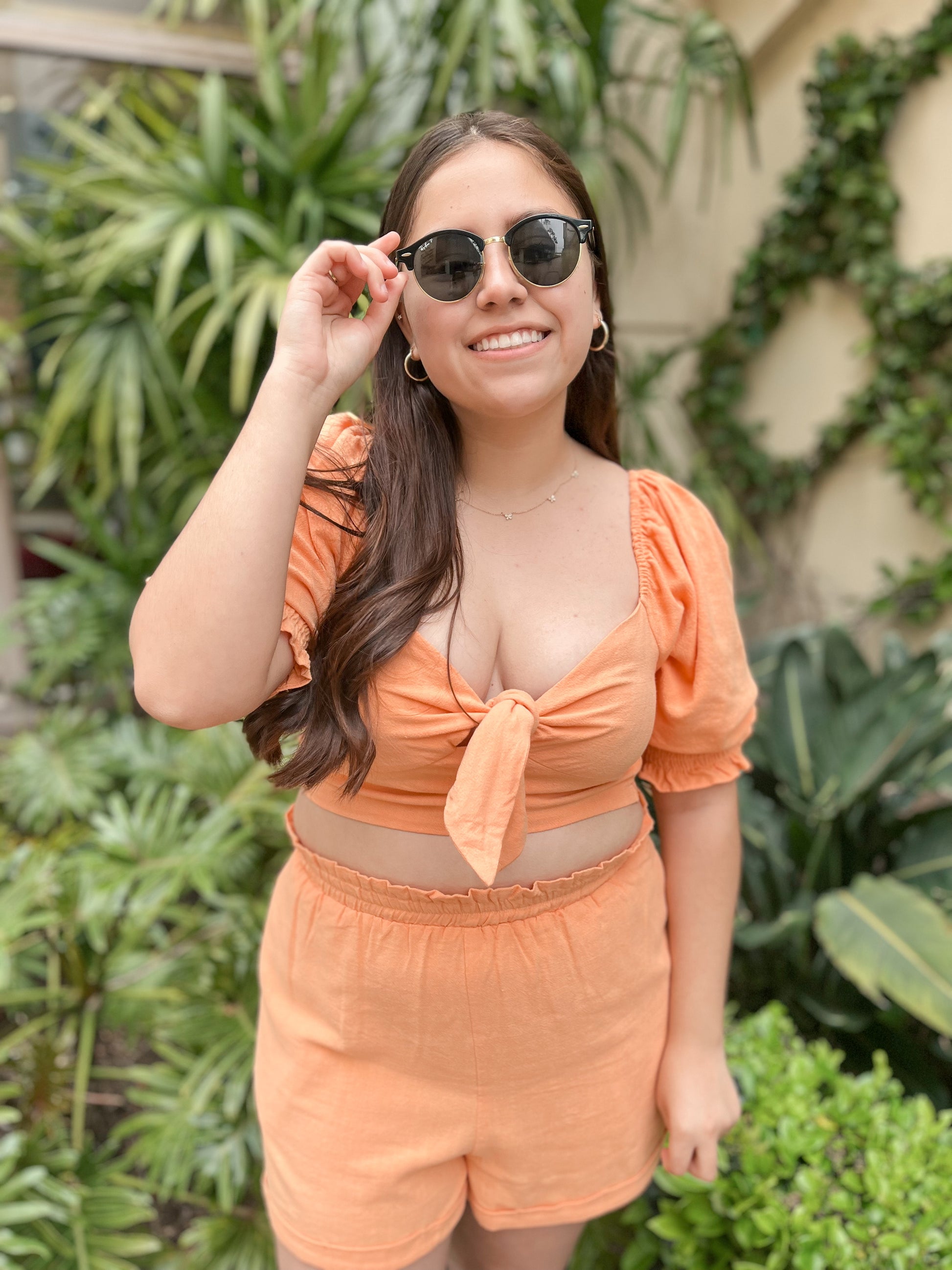 Cropped top with side zipper. Elastic waist shorts with side pockets. Relaxed fit.